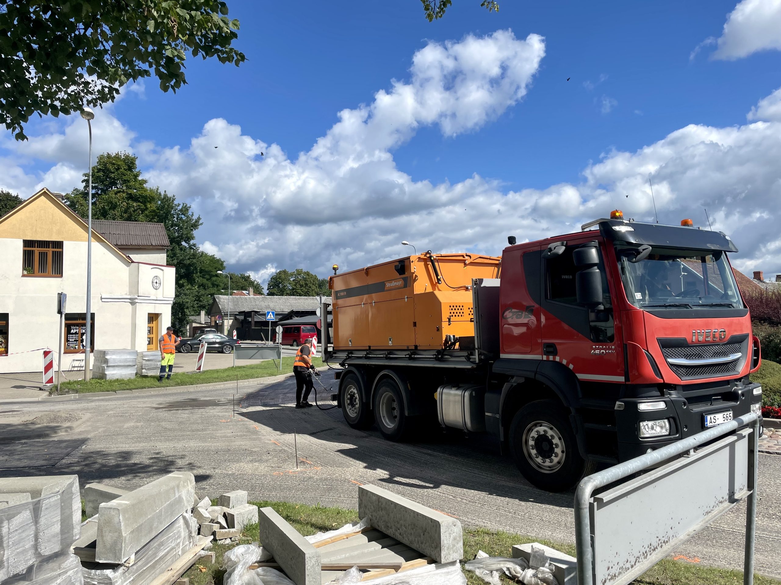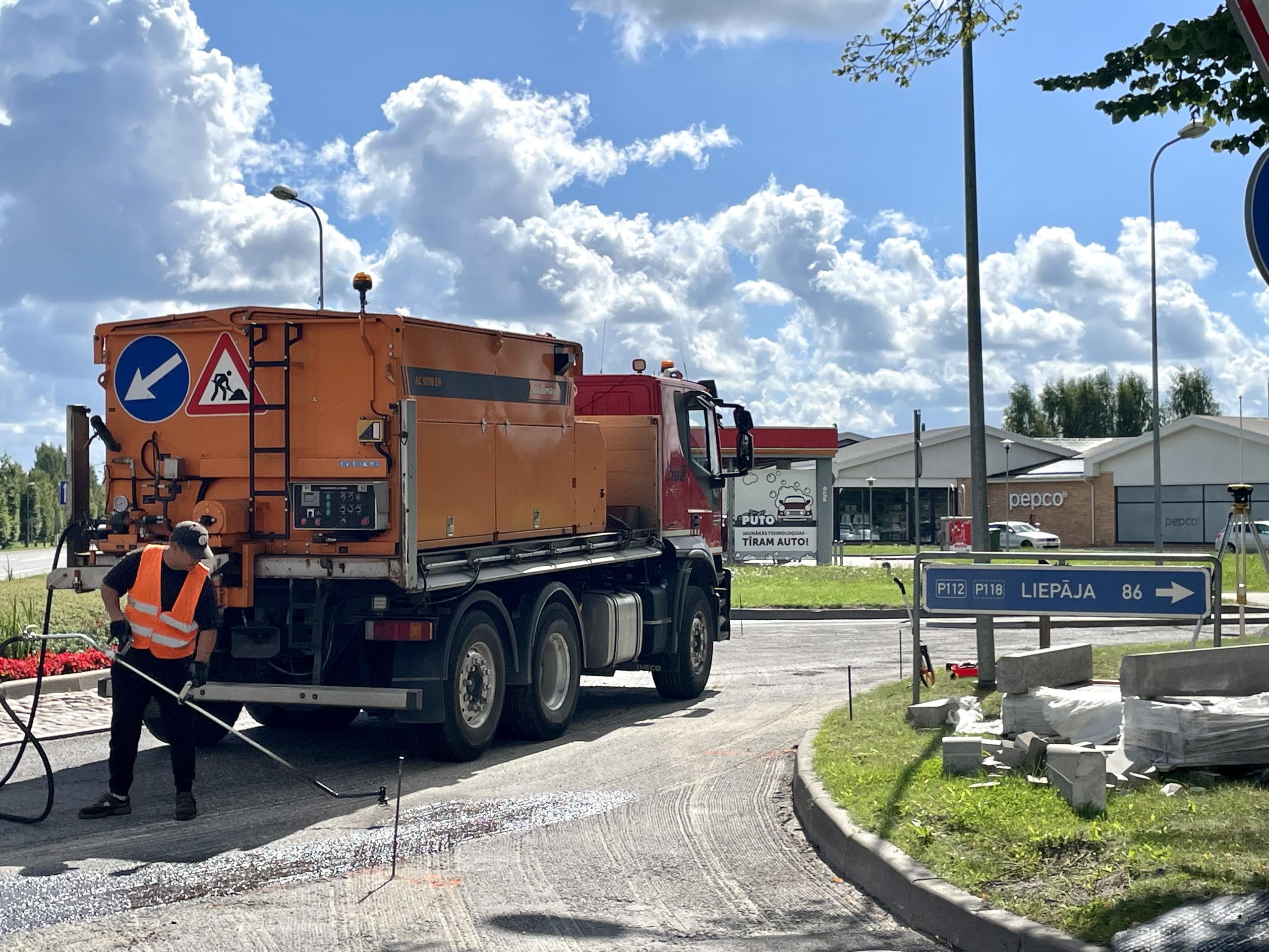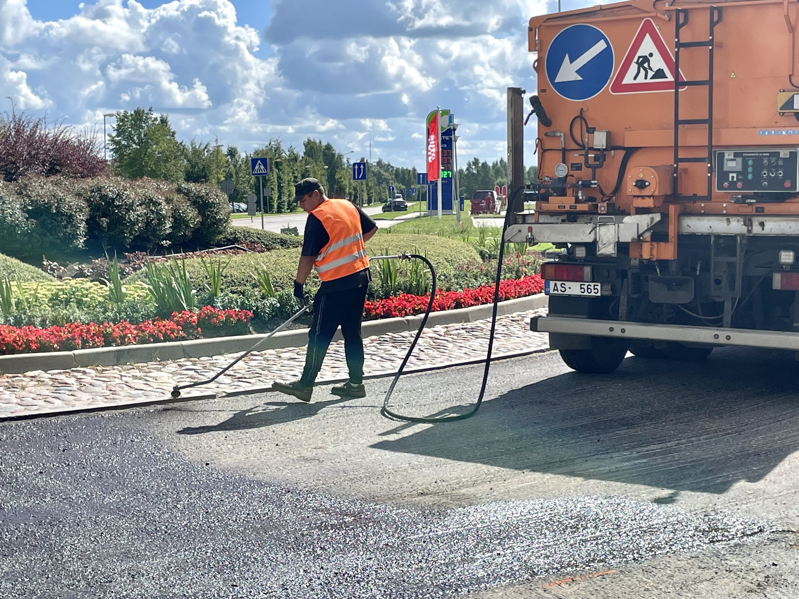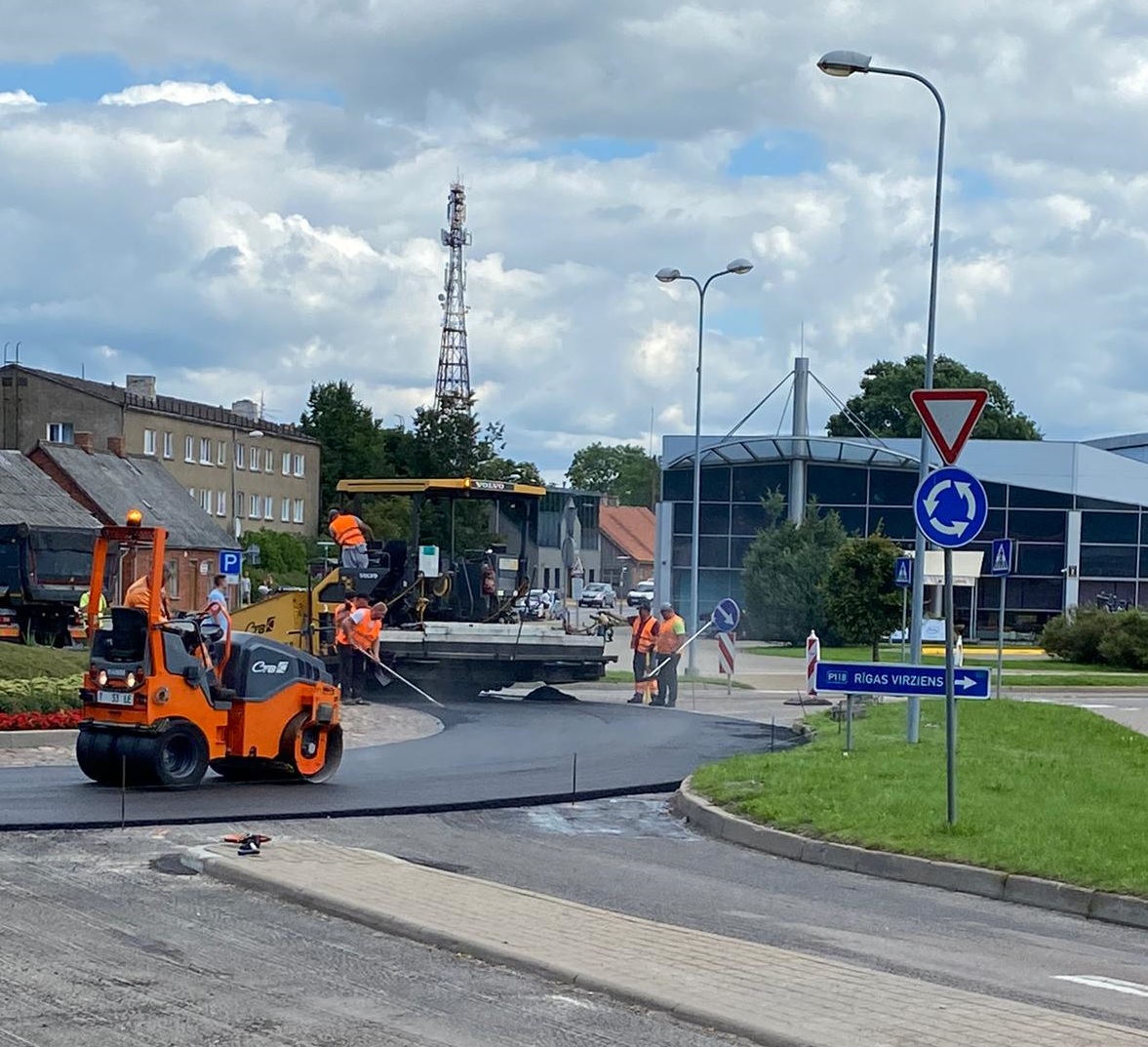 Remontdarbus ietekmē lietainie laika apstākļi, taču laikam uzlabojoties, tie atsākti –  rotācijas apļa brauktuves labošanas darbi un asfaltbetona seguma ieklāšanu plānots pabeigt tuvāko divu nedēļu laikā.
