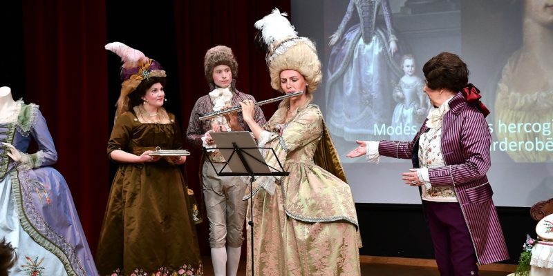 Izstādē apskatāmi 18. gs. franču rokoko stila dāmu un kungu tērpu komplekti, angļu silueta dāmu tērpi un gadsimta izskaņas neoklasicisma modes paraugi, kā arī “Mazās muižas” kolekcijas jaunākais papildinājums – Hercogienes Dorotejas ampīra stila tērps “Tulpe”.