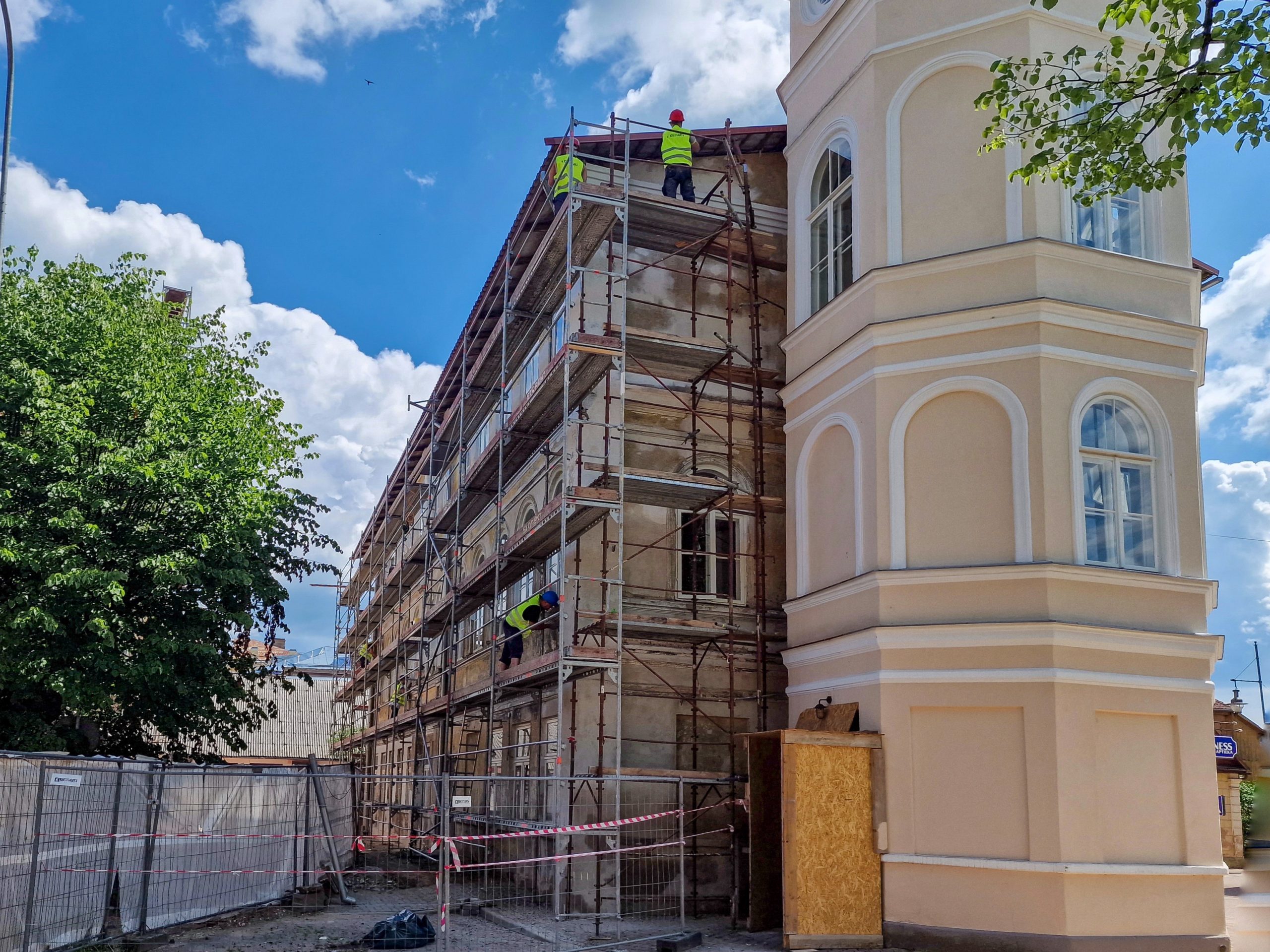 Objektā jau ir veikta esošo pamatu vertikālā hidroizolācija ar injekcijas metodi, mikropāļu izbūve, pamatu aizmūrēšana ar laukakmeņiem, un šobrīd notiek sagatavošanas darbi jumta seguma demontāžai.