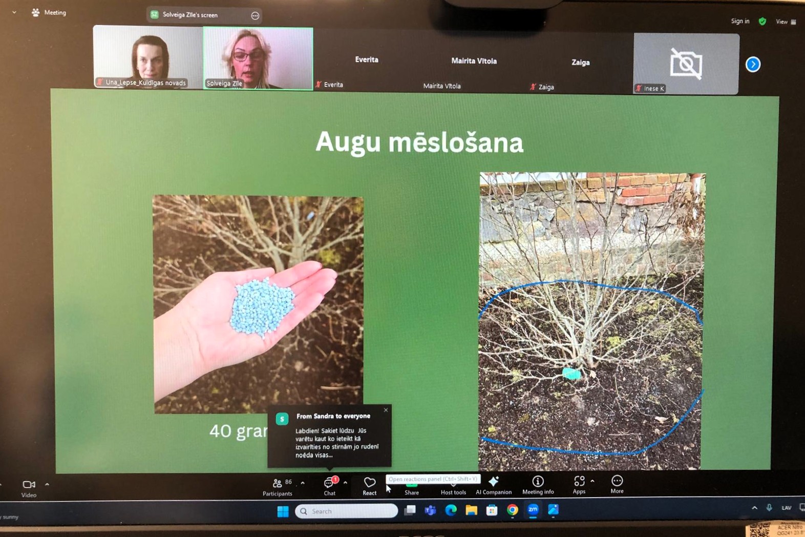 - “Palīdzi dārzam uzplaukt!” (Kuldīgas novada organizēts tiešsaistes seminārs) – 86 dalībnieki. Nodarbību vadīja Solveiga Zīle, dārzniece un saimniecības “Lazdkalni” īpašniece.